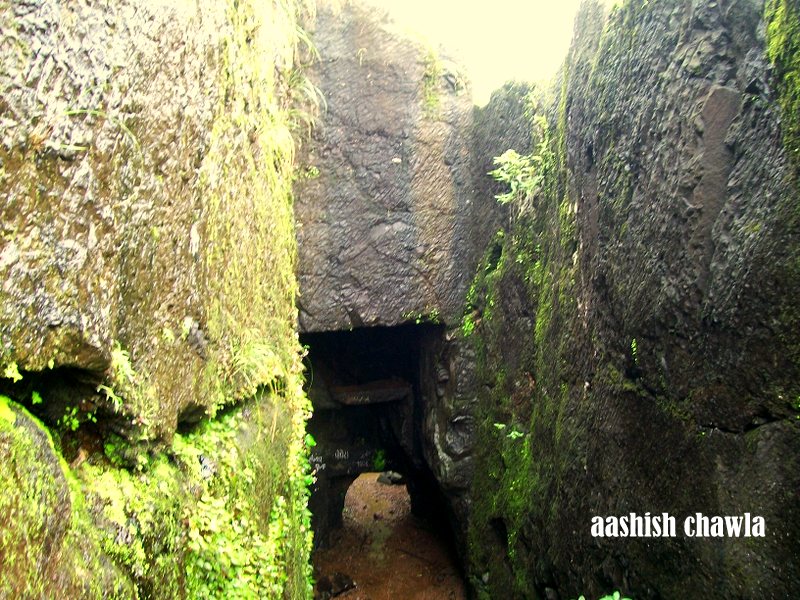 Once you reach near the rock formation start traversing from the right side and you would notice cave cut out in this rock and on your right is deep valley.