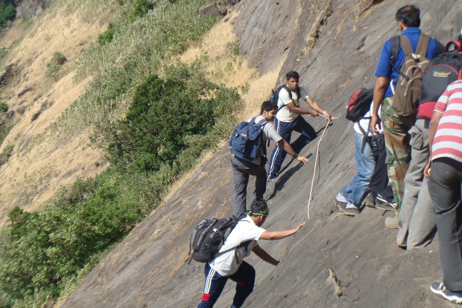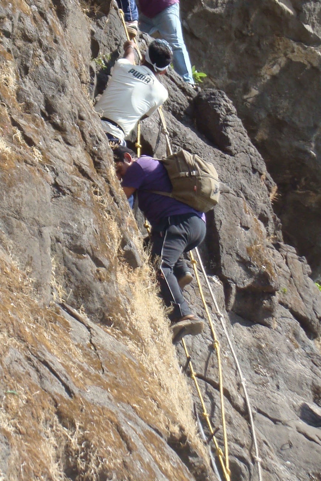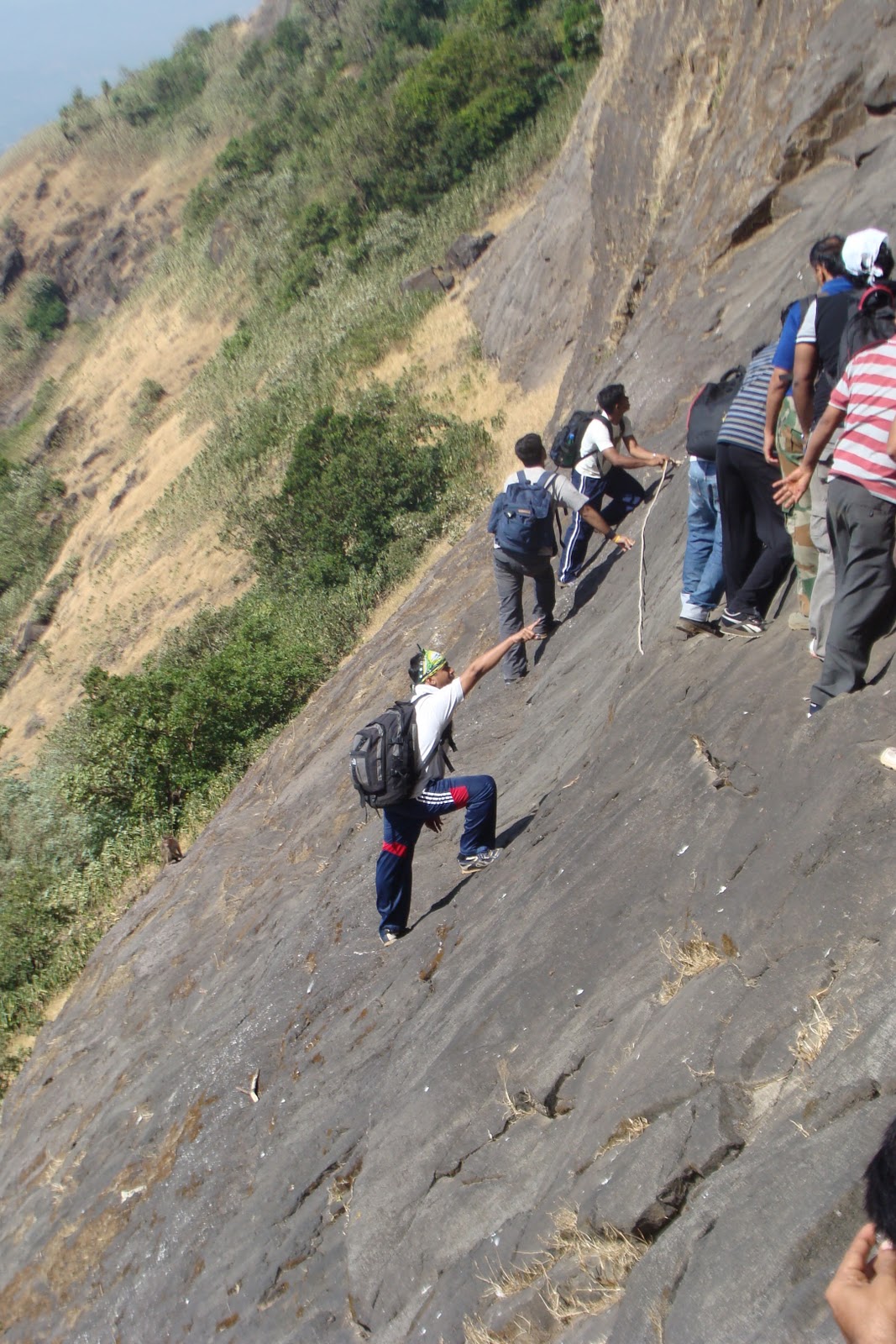 We all had lunch in the caves few of our friends decided to catch up with a nap at the top,with a break of over I/2 hour we were all ready for the descent. Same rocky patch same 90 degree all over again Sab ki aachi fati….photo me pose dene ko bi dar lag raha tha…so bola bhai camera rakho jaisa bi latka honga photo nikal lena…aage bhagwan malik… one look down in the valley aur apke hosh gul man !!!! somehow we crossed the whole section again for me it was was double bonanza daring act plus style mar mar ke photo lene ki opportunity..(andar se kya halat thi woh mere ko hi maloom tha…)