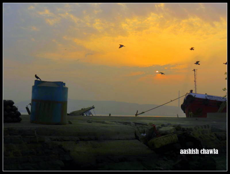 Another 5 minutes walk with more oil tankers along the road I was wondering whether I am going in a right direction because the way the things looked here I was left wondering “Flamingo toh chodo ek Kauva (crow) bhi nahi deknewala.”But to our surprise the road ultimately ends with lots of anchored boats on the side and lovely sunrise greeting us.