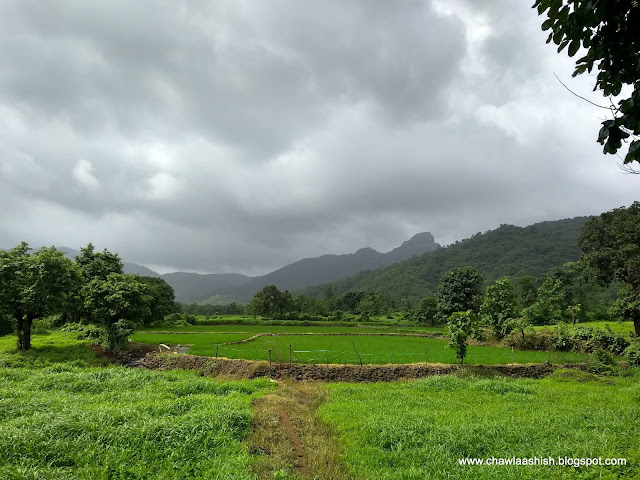 We started our trek at 10.05 am. As we walked till the end of the village the route opens to a big field. The lush greenery and the majestic Manikgad could be seen.