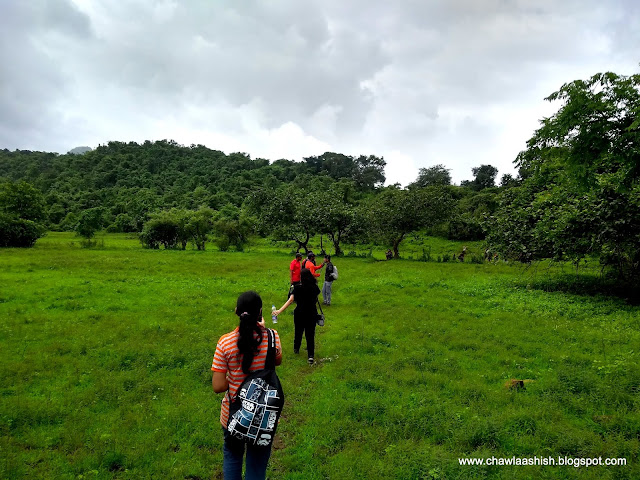 We started our trek at 10.05 am. As we walked till the end of the village the route opens to a big field. The lush greenery and the majestic Manikgad could be seen.