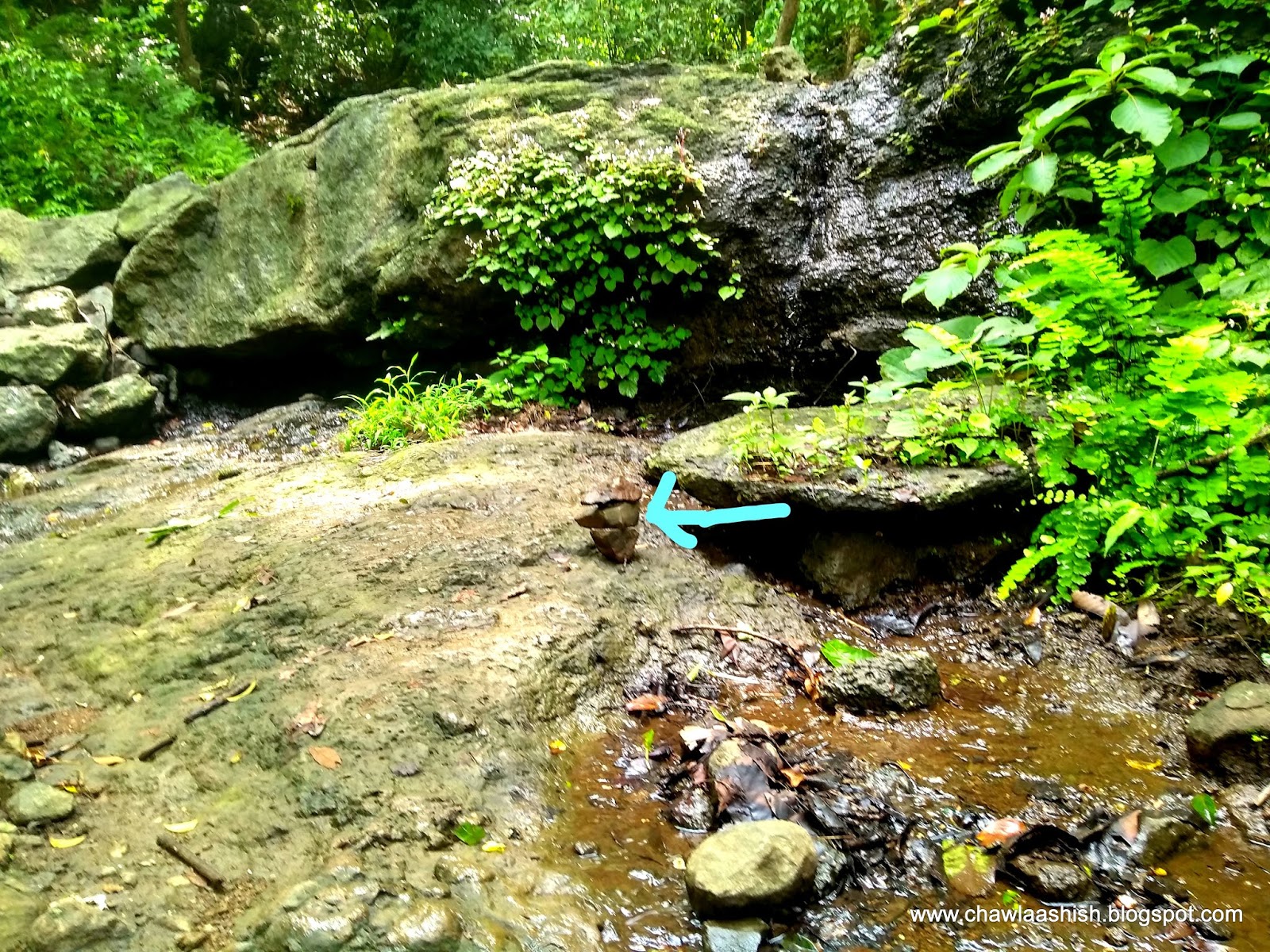 30 minutes walk into the forest and we reach the diversion point from where we take right turn. landmark huge tree in front and a waterfall on your left ( water may and may not be flowing as its a small waterfall).
