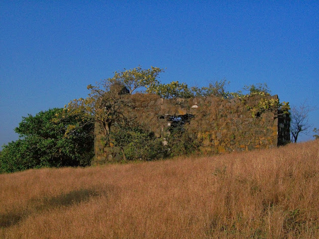 The noticeable thing about this water-tank is that there is a water coming into it from a tube which is of the shape of cow’s mouth. This water-tank is therefore also called as Gaumukh. I was informed by a villager that water is available in this tank till most part of summer.(But my advise would be better refill your bottles at Ashram or at Sagargad Machi. Standing at this watertank with your back toward the Shiva Temple you may not be able to see Vanartok but don’t worry its the contours of the mountain that’s hiding it.Keep walking towards the direction of Vanartok, little left first and then right till you come across ruins of british quarters . One can see gigantic plateau which offers a fantastic sight.