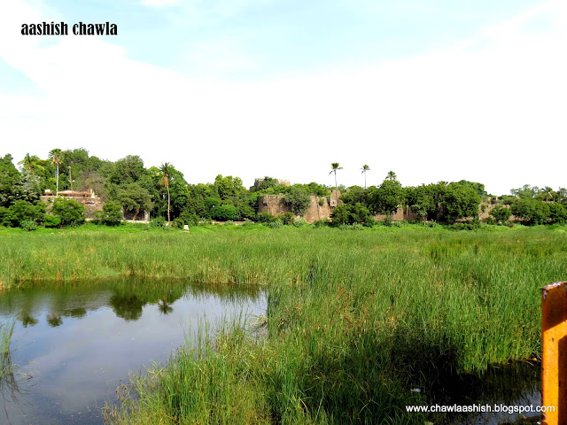 After depositing our shoes at the shoe counter .We started to move towards the temple.The temple wall was running on our right side and the lake on our left side and nestled in the laps of trees we could see glimpses of outer wall of Bhuikot or Solapur Fort.